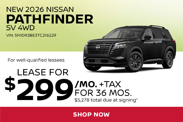 *Lease a New 2026 Nissan Pathfinder SV 4WD for $299/mo (STOCK# N37431, VIN 5N1DR3BE3TC216229, MSRP $44,075) Well-qualified lessees may lease for $299/mo for 36 months with $5,278 total due at signing (includes down payment, first monthly payment, bank acquisition fee, $784 doc & title prep fees, $0 security deposit). Sales tax, title, reg/license fees additional. Includes $1,000 NMAC lease cash. Lease based on selling price of $41,577 before application of lease cash. Closed end lease. 5,000 miles/year. All incentives to dealer, cannot be combined with other offers. Take delivery by 5/4/2026.
