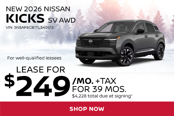 *Lease a New 2026 Nissan Kicks SV AWD for $249/mo (STOCK# N37353, VIN 3N8AP6CB1TL340513, MSRP $29,325) Well-qualified lessees may lease for $249/mo for 39 months with $4,228 total due at signing (includes $2,500 down payment, first monthly payment, bank acquisition fee, $784 doc & title prep fees, $0 security deposit). Sales tax, title, reg/license fees additional. Includes $1,125 NMAC lease cash. Lease based on selling price of $27,978 before application of lease cash. Closed end lease. 5,000 miles/year. All incentives to dealer, cannot be combined with other offers. Take delivery by 3/2/2026.