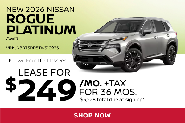 *Lease a New 2026 Nissan Rogue Platinum AWD for $249/mo (STOCK# N37470, VIN JN8BT3DD5TW310925, MSRP $41,000) Well-qualified lessees may lease for $249/mo for 36 months with $5,228 total due at signing (includes down payment, first monthly payment, bank acquisition fee, $784 doc & title prep fees, $0 security deposit). Sales tax, title, reg/license fees additional. Includes $1,000 NMAC lease cash and $2,000 MY26 Rogue Platinum Lease Bonus Cash from Nissan. Lease based on selling price of $39,445 before application of lease cash and bonus cash. Closed end lease. 5,000 miles/year. All incentives to dealer, cannot be combined with other offers. Take delivery by 5/4/2026.